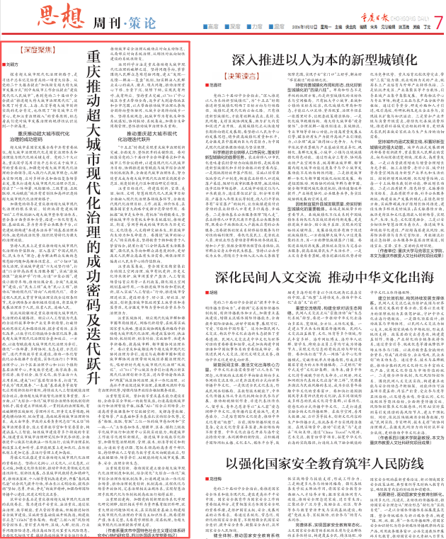 1月12日,我校黨委書(shū)記劉嗣方撰寫(xiě)理論文章《重慶推動(dòng)超大城市現(xiàn)代化治理的成功密碼及迭代躍升》在《重慶日?qǐng)?bào)》思想周刊上發(fā)表。