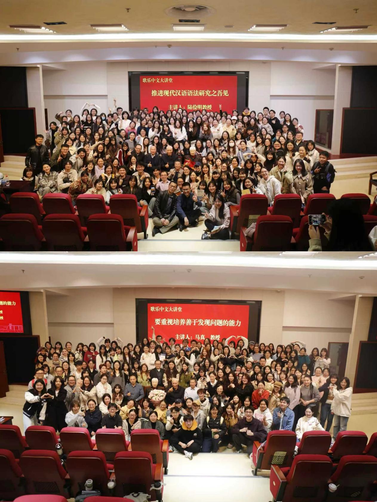 活動(dòng)伊始,原定的立德樓A609報(bào)告廳座無(wú)虛席,六樓走廊也擠滿了慕名而來(lái)的聽眾,現(xiàn)場(chǎng)熱度遠(yuǎn)超預(yù)期,主辦方臨時(shí)將講座轉(zhuǎn)至圖書館報(bào)告廳。途中,陸儉明教授、馬真教授被學(xué)子們圍攏請(qǐng)求簽名、合影,互動(dòng)氛圍熱烈;部分未能進(jìn)入主會(huì)場(chǎng)的聽眾通過(guò)直播同步學(xué)習(xí),全場(chǎng)學(xué)術(shù)熱情高漲。